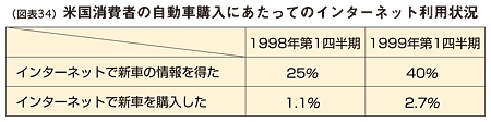 その一方で、同調査によれば、1999年第1四半期に自動車を購入した消費者のうちインターネット上で情報を得ている消費者は40%に達しているものの、インターネット上で購入契約まで行う消費者は3%に満たない(図表34)。自動車のような高額商品については購入契約を実店舗で行う割合が低額商品に比べ高くなるものと考えられるが、割合の多寡はともかく、いずれの商品についても同様の消費行動が行われているものと思われる。