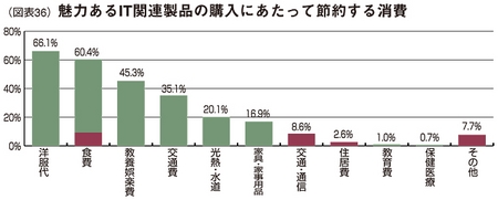また、IT関連新製品の購入原資を捻出のために節約される消費の費目を尋ねたところ、洋服代や食費の割合が高く、次いで、教養娯楽費、交際費が挙げられた(図表36)。一般に消費は、衣・食・住関連など生活に不可欠な「必需的消費」と趣味・娯楽を目的とする「選択的消費」に分類される。節約する費目の上位に、一般的には必需的消費とされる洋服代や食費が挙げられたことについては、洋服代や食費の一部は生活のゆとりとしてのファッションや外食など「選択的消費」としての性格を有しており、この部分が節約の対象になっているものと考えられる。