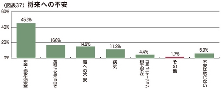 一方、消費者は消費行動の決定に際しては、生涯にわたる収入・支出を勘案しつつ、現時点で支出可能な金額を判断していることから、将来の収入に対する不安が大きい場合には情報収集手段が多様化しても消費は拡大しない可能性がある。現在、消費者が感じている将来の不安としては、年金・老後生活資金が最も大きく、加齢による不自由さ、職への不安が続いており(図表37)、これらは消費の抑制要因となっているものと考えられる。
