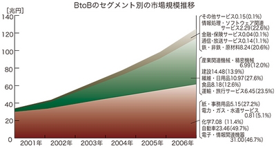 その中で、2001年の注目分野は、完成製品・生産財・間接財等の物取引では自動車、産業関連機械、紙・事務用品、サービス関連では運輸・旅行サービスがあげられる。