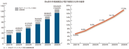 3. BtoB市場の将来展望 5年後の2006年には、BtoB市場規模が約125.4兆円に達するものと予想される。また、電子商取引化率も17%を突破する見通しにある。