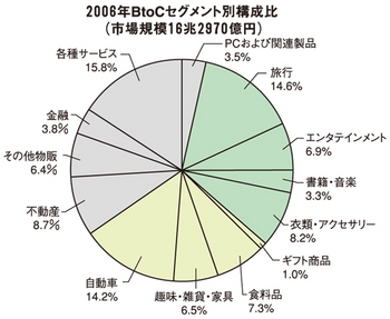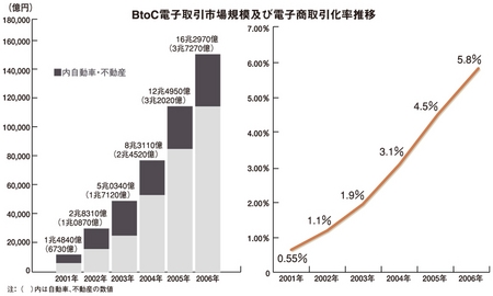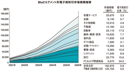 2006年には、BtoC電子商取引の市場規模は16兆2970億円、電子商取引化率は5.8%というのがこの報告書の見通しだ。パソコンおよび関連製品は、EC化率は34%と最も高いにもかかわらず、市場規模は5670億円といささか低すぎるのではないかと思える額を出しているのが腑に落ちない。ともあれこの予測の最終回である。