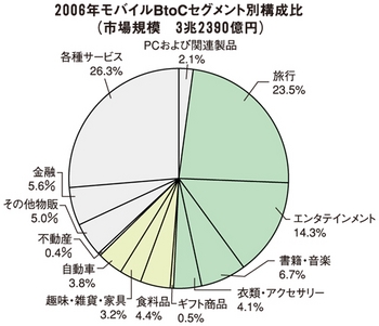なお、セグメント別に見ると、2001年では、着信メロディを中心とするエンタテインメントがモバイルコマース市場全体の70%を占めているが、2006年には旅行やサービスにおけるモバイルコマースが進展し、セグメント間の格差は縮小すると思われる。