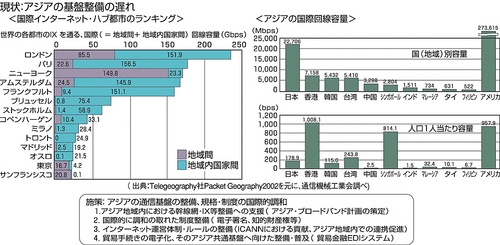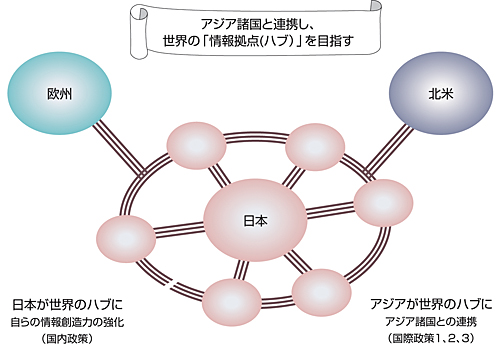 「世界の情報拠点(ハブ)を目指して」の発想の根底にあるのは、アジアの情報流通は大きく遅れているという問題意識である。第11回IT戦略本部議事録を読むと、事務局から「アジア、北米、欧州について世界の貿易流通という側面から見ると、ほぼ均衡した関係が維持されているが、情報流通という側面から見るとアジアは大きく立ち後れており、この不均衡是正が急務だ」と問題提起されている。具体的には、「アジア地域内の次世代高速インターネット網の整備」のために、「アジアブロードバンド計画」を策定、日本が積極的に貢献する方向を模索するとしている。