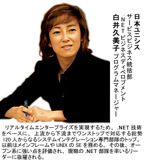 白井 日本ユニシスでは、当初から.NETで大規模なミッションクリティカルなシステムを構築することに焦点を絞っています。 ここ数年、ミッションクリティカルな基幹業務システムにオープン系の技術を導入する動きが活発化しています。コストや拡張性を見込んでの動きです。これまでは確かに、顧客企業がオープン系の技術を採用する際、まず考えるのがJ2EEでした。ところが昨年あたりから、オープン系の技術の候補として、J2EEに加えて.NETを選択肢に加える顧客が急増しています。