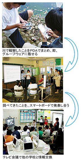 ■「花室川プロジェクト」 「隣の学校が、変わった魚を発見したらしいぞ!」。つくば市内を縦断する1級河川の花室川流域に位置する小中学校6校が、各校で実施した水質調査や水生生物の調査結果を共有グループウェアの電子掲示板に随時掲示──。これは、電子掲示板の書き込みなどをもとに、各校で学習内容を深めていき、3月に学習成果としてまとめる「花室川プロジェクト」と呼ばれる実践だ。同市内では03年度、こうした学校間の「共同学習プロジェクト」のテーマが42種類も立ち上がっていた。