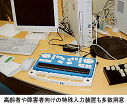 「テレワーク作業室」は、石蔵および土蔵を改装、高齢者や障害者のテレワーク作業者が作業を行うためのスペースなどを設け、点字の入出力、50音キーボードなど、特殊な入力装置なども多数用意した。