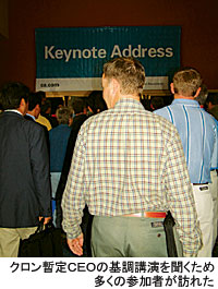 米CAが今後も安定したビジネスを展開していこうという意気込みは、開幕直後のクロン暫定CEOによる基調講演でも鮮明だ。クロン暫定CEOは、「会計処理の問題や経営陣の入れ替えなど厳しい局面を迎えたのは事実」と冷静に述べながらも、「しかし、当社は人材をはじめ技術、製品などの面で強い力をもっている」と言明。新しい経営陣のもと、今後も新しい製品やソリューションを提供していくとして、「caworld2004」の開催は「新しい幕開けでもある」と公言した。