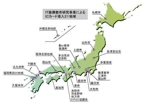経産省は、01年度の補正事業である「IT装備都市研究事業」で、ICカード普及利用の実証実験を全国21地域で行った。大和市もその1つだが、このほかにも札幌市(北海道)、横須賀市(神奈川県)を中心とした湘南地区、上越市(新潟県)、岡山市(岡山県)、下関市(山口県)など、IT先進都市もそうでない都市も含めてICカードを採用し、住民票の自動交付や施設予約など市民サービスの向上に生かす取り組みを始めた。