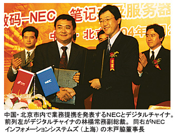 急成長する中国IT市場で、日系ベンダーのシェア拡大策が本格化している。NEC、富士通など日系大手ITベンダーは、対中戦略でこれまで大きく出遅れており、劣勢を挽回するためのアライアンスやターゲットの絞り込み、高付加価値化など、あらゆる手法を駆使してシェア拡大に努めている。NECは6月29日に、中国最大手のディストリビュータであるデジタルチャイナ(神州数碼、郭為・総裁兼CEO)と業務提携し、拡販に向けた第1歩を踏み出した。富士通もターゲットを明確化するなど、販売効率の向上に力を注ぐ。(安藤章司)