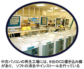 中古パソコンの再生では、筐体のクリーンアップで新品と同様に仕上げているほか、電源ケーブル類をすべて新品に交換。HDD(ハードディスク装置)のデータ消去は、米国防総省の標準規格を採用した専用ソフトウェアを開発した。データ消去後は、一部アプリケーションソフトウェアの削除や電子マニュアルのインストールを自動的に行い、中古パソコン用のバックアップソフトCDを自動作成する。工場内には、CDライターを8台設置、1日で最大800枚のバックアップCD作成が可能だ。