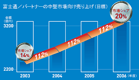 富士通(黒川博昭社長)は、パートナーを主体とする中堅企業市場向けビジネスで、売上高を3年連続で2ケタ増とする目標を掲げた。システム案件の小口化が進んでいることから、パートナーの商談期間を現在の平均4.7か月から平均3か月へと短縮。案件獲得数を増やすことで売上増につなげる。今年度(2005年3月期)から06年度(07年3月期)まで毎年度12%増の売上成長を達成し、中堅企業市場におけるシェアを昨年度(04年3月期)の14.4%から06年度に20%へと拡大する。
