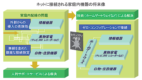 これに対応するソリューションを提供していけば、潜在ニーズを掘り起こせる。それには、ハードもソフトも簡単に使える仕組みが必要。例えば外から自宅のサーバーへアクセスすることで、「こんなに楽しくなる」という提案が必要だ。また、ホームネットワークの煩雑な配線は普及の障害になるため、ホームゲートウェイなどの技術での解決も図られるが、人的サポートも重要となる。これもショップやネットワークプロバイダのビジネスチャンスだ。