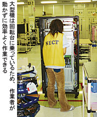■ハードの利益率7%目指す 大型コンピュータの生産工程は、全8工程のうち各工程を1人で担当。工程進行に従って本体を移動する「1台流し生産」を行っている。筐体を回転台の上に乗せ、作業者は同じ位置で無駄なく組み立てられるようにし、また、操作を軽くすることで女性でも扱いやすいように工夫されている。生産能力は、メインフレームが月間約20台、スーパーコンピュータが同約15台。ここでも水すましが組み立てに同期して各ステーションへ部材を供給している。