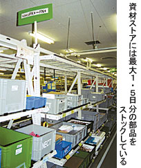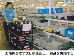 工場内では、生産を円滑にするために、部品を1.5日分ストックしておく資材ストアを設け、「水すまし」と呼ばれる部品の運搬要員を巡回させて必要部材の適正な配分と効率化を図っている。