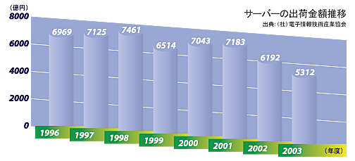 電子情報技術産業協会(JEITA)の調べによると、サーバーの出荷金額は2002年度(02年4月-03年3月期)、03年度(03年4月-04年3月期)と連続して前年度を下回り、03年度は5312億円(02年度は6192億円)となった。今年度上期(04年4-9月期)は、IT投資が回復基調にあることから、台数ベースでは前年同期比9%増と伸びたが、金額の伸び率は同3%増にとどまり、低価格化傾向が浮き彫りとなっている。