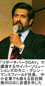 また、セキュリティ対策についてサイバーソリューションズのキニ・グレン・マンスフィールド社長が講演した。同社は、容易な設定で社内のイントラネットを監視できるIDS(不正侵入検知システム)を開発したセキュリティベンダー。セキュリティ対策は、顧客の規模を問わず必要なことに着目し、中小企業でも扱えるように複雑な知識を必要としないアプライアンス型IDSの販売事業をメインとしている。マンスフィールド社長は、「企業内システムから情報の持ち出しが横行している。最も監視しなければならないのは社内のイントラネット」とIDSの必要性を強調する。同社は、97年設立のITベンチャーだが、「中小企業にも扱いやすいIDS」というニッチな市場で、存在感を示している。