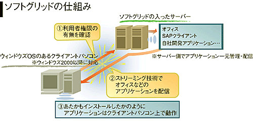 ■IT運用・管理が容易になる ソフトグリッドは、必要に応じてアプリケーションをサーバーからクライアントPCへストリーミング技術を利用して配信するソフトウェア。クライアントPCにはアプリケーションソフトをインストールせず、ユーザーのログイン時にアクセス権限のあるアプリケーションを配信する。動作は快適で、あたかもインストールソフトを使う感覚で使用できるという。