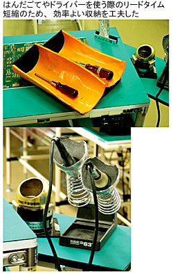 PIU(プラグインユニット)のラインでは、ラインリーダーや作業員が現場で編み出した工夫が随所に生かされている。例えば、頻繁に使うはんだごてやドライバーなど工具類の収納も、現場ならではのアイデアで使いやすくセットされリードタイムの短縮につなげる努力がなされている。