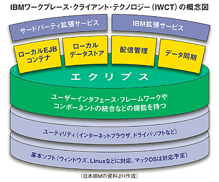 年内をめどに販売を始める「IBMワークプレース・マネージド・クライアント(IWMC)」は、IBMの技術構想「IBMワークプレース・クライアント・テクノロジー(IWCT)」をベースに開発する。IWCTの中核部分は、2001年9月にオープンソース化したリッチクライアントのプラットフォーム「エクリプス」を使う。リッチクライアントの中核部分のソースコードを開示することで、オープンソースソフトの開発コミュニティからも支持を得ている。IWMCでは、エクリプスにサーバーとのデータ連携やクライアントにおけるデータ管理などの付加機能を加えることで製品としての価値を高めている。