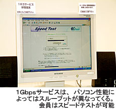 このほど大阪で開催されたビジネス総合展示会「ビジネスショウOSAKA2005」では、出展企業中最大のブースを設置して1GbpsのFTTHサービスを披露した。100Mbps接続と比較できるようにして1Gbpsの高速性をアピール。来場者の多くがブースを訪れ、1Gbpsサービスを体験していた。