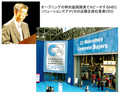 ■基調講演はNEC米法人社長 C3 Expoの「C3」とは、「コーポレート」、「チャネル」、「コンピューティング」の3つを意味する。ネットワーク関連技術、モバイルやワイヤレス、セキュリティやデータベース、そして教育分野への利用など多方面でのIT産業の関わりとその今後を模索する展示会である。参加企業は世界各国から集まり、また大手企業のみならず中小企業やベンチャーまで参加し、関係者の注目度も高い。