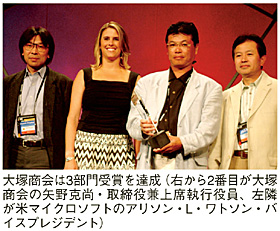 | 大塚商会、パートナー授賞式で3部門獲得 | | | | | 「WPC2005」では、世界各地の優秀なパートナー企業を表彰する「マイクロソフト・パートナー・プログラム・アワード」も開催された。このうち、各部門ごとに最も功績の高かった1社だけに贈られる「パートナー・オブ・ザ・イヤー・アワード」の「Winner(受賞社)」に、大塚商会と富士通の2社が日本企業で初めて選ばれた。しかも、大塚商会は複数社に贈られる「カスタマー・エクスペリエンス・アワード」を含め、3部門で「Winner」を獲得するという快挙を成し遂げた。 大塚商会が受賞した3部門は、「ライセンス・デリバリー・ソリューションズ」の「セールス・アンド・マーケティング」部門、「ネットワーキング・インフラストラクチャ・ソリューションズ」の「セールス・アンド・マーケティング」部門、「カスタマー・エクスペリエンス・イニシアティブ」部門 |  | (複数社が受賞)。富士通は、「ISV/ソフトウェア・ソリューションズ」の「セールス・アンド・マーケティング」部門で受賞した。 大塚商会の矢野克尚・取締役兼上席執行役員LA事業部は、「日本初の単独受賞に加え、3部門を獲得したことは嬉しい」と喜びの声もひとしお。一条清・LA事業部特販課シニアコンサルタントも、「昨年は、複数社に贈られる賞しか獲得できなかったため、悔しい思いをした。今年は、昨年よりも受賞数が多いこともあって参加した甲斐があった」と顔をほころばせる。 マイクロソフト日本法人の宗像淳・業務執行役員ビジネスパートナー営業本部長は、「単独受賞のパートナーが出たという点で、日本の存在感が一段と大きなものになる」と手応えを感じていた。 | | | | |