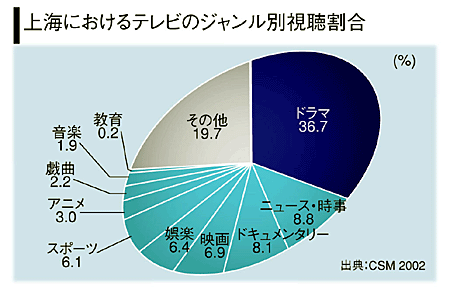 上海で視聴されている番組をジャンル別に見てみると、ドラマが36.7%、ニュース・時事が8.8%、ドキュメンタリーが8.1%、映画が6.9%と、ドラマの視聴割合が高いのが特徴だ。上海市民のドラマ好きがよく表れている。