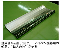 「これならば」と許可を得て見せてもらったのは、医療用デジタルレントゲン装置のフイルムガイド。レントゲン装置内でスムーズにフイルムを送り出すために、表面には「ミクロン以下の精度が要求されます」(五十嵐氏)という。万一、フイルムに傷がつけば誤診の原因にもなりかねない。そのために、「工具も自ら作り、その工具を調整したり何度も試行錯誤を繰り返して、ようやくアルミ材から削り出す技術を作り上げた」という。こうした五十嵐氏の努力に応えるため、富士通フロンテックは「マイスター」という称号を五十嵐氏に与え、同氏の名刺には「現代の名工」、高度熟練技能者認定、特殊技能士などと並んで「meister」と誇らしげに記されている。