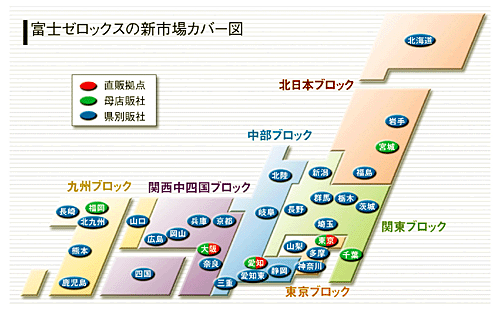 具体的には、①直販部隊は東京、名古屋、大阪に集約、大手企業を核とする国内外の企業群に対する営業に特化。コンサルティング専門部隊の配置、バックオフィスの強化などにより、顧客のより高度な要求に応えられる体制をつくり、「ハイバリューサービス営業力の創造」を目指す、②地域の顧客はすべて販売会社が担当、直販で鍛えられた人材を投入するとともに、保守サービス機能を販売会社に統合し、営業・保守サービスを一体化させる。また、全国を6ブロックに分け、地域ブロックによるマーケティングの統合的な展開を図る――体制にした。