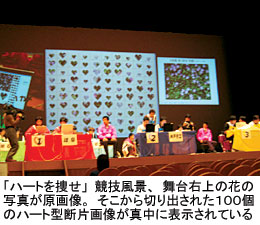 参加校は、まず最初に原画像を競技用のサーバーからダウンロードする。つぎに、原画像からハート型に切り出された100種類の断片画像が、サーバーから与えられる。それが原画像のどの座標から切り出されたものかを解析せよというのが問題だ。舞台のうえに各校の代表が並び、出題されたテーマに対して、プログラムの精度と時間と最適解を競う。