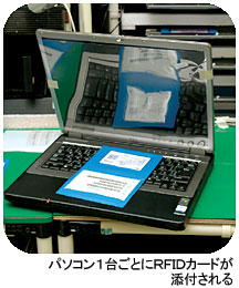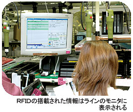 04年9月のRFID導入では、そのラインにRFIDリーダとモニタが設置され、生産指示の内容がモニタ上に表示されるようになった。パソコン生産ではビジネス用を中心にBTO(受注生産方式)による小ロット生産が当たり前になっている。1台ごとに異なる生産指示は、従来のバーコード方式の場合、「1日で10万回もの読み取り作業が必要」(同)だった。組み立てるパソコン1台1台にRFIDカードが添付されていることで、そのRFIDカードを作業台に置けばカードリーダが情報を読み取り、目の前のモニタに生産指示が表示される。作業者はそれを見て、オーダーされた仕様のパソコンを組み立てればよい。