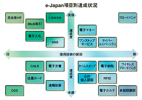 2001年度から5年間にわたって展開されたe-Japanプロジェクトは、今年3月末で幕を閉じる。その成果についてはさまざまな評価があるだろうが、第2次大戦後60年におよぶ政治・経済・社会の制度疲弊、少子高齢化社会への備え、産業構造の転換など、「改革」の実効は06年度以後の動きに委ねられている。公共分野の電子化に投入された巨額の予算は、IT産業にとって「追い風」になったことは確かだろう。92年以後に起こった経済環境の変化と目まぐるしい技術革新に、IT産業、なかんずくソフト/サービス業は大きく揺れ動いた。そうしたなかでe-Japanプロジェクトはどのような意味を持ち、何を生み出したのか。(佃均(ジャーナリスト)●取材/文)
