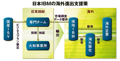 海外進出支援策は、日本IBMのISV支援部隊など10人程度で組織した新設の専門チームが担当する。大和事業所(神奈川県大和市)の開発要員と連携して製品を開発する。IBMには「Partner World ISV」という技術・販売両面を包括的にバックアップするISV支援プログラムがすでにある。これをベースに国産ISVに適した国内独自の仕組みとして提供する。