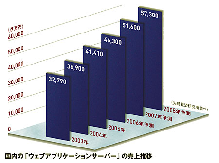 日立は今年度(07年3月期)のAPサーバー売上高について、前年に比べ10%以上の伸びを期待。富士通も20%弱の成長に達すると予測する。両社の目標値は「例年以上の伸び」だ。NECは、売上規模が「WebOTX」と同等に達するほど、「WebLogic」を大量に販売する優良代理店。NECの渋谷マネージャーは「『WebLogic』は、グローバル企業でニーズが高い。しかも『WebOTX』との棲み分けはできている」と話す。しかし、将来的には「『WebOTX』を毎年120%成長させ、国内トップ3を目指す」(同)と、自社APサーバーを拡大する方針だ。