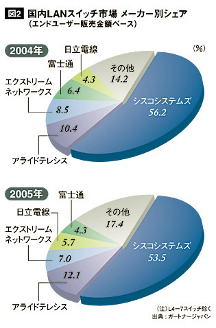 圧倒的なマーケットシェアを誇っているのはシスコシステムズ。ガートナージャパンによれば、L2/3スイッチ分野で05年に53.5%を獲得した。2位以下は、アライドテレシス、エクストリームネットワークス、日立電線、富士通と続く。