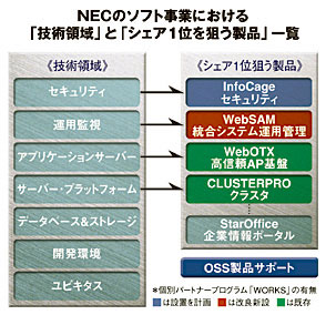 同社は、セキュリティ、運用監視、アプリケーションサーバー、データベース&ストレージ、サーバー・プラットフォーム、開発環境、ユビキタスの7つをソフトの「注力技術領域」としている。このうち、「CLUSTERPRO」「WebSAM」「WebOTX」「InfoCage」、企業情報ポータル「StarOffice」の5ブランドを強化、各領域で国内シェアトップを目指す方針だ。