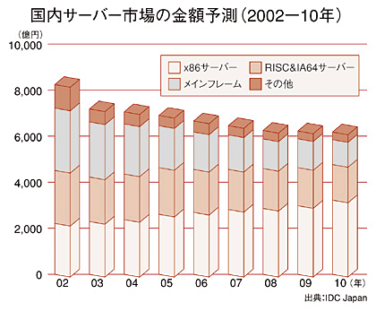 オープン化の影響を受けて単価下落が続くサーバーは、販売台数は伸びても利益確保が難しい。この状況は、07年も続くだろう。ハードの単価下落は、付随する保守サービス単価の下落を招き、保守サービスも手がけるSIerにとっては二重の悪影響を受ける。調査会社IDC Japanが昨年11月に発表したサーバーの国内市場規模予測の最新データによると、06年の市場規模は前年比3.7%減の6667億円で、昨年3月発表時に比べ2.0ポイント下方修正。05年から10年までの年平均成長率はマイナス2.2%。x86系サーバーを中心に台数は伸びるが、価格下落の影響で金額は下がるとみる。