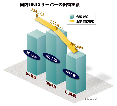 電子情報技術産業協会(JEITA)によれば、UNIXサーバーの出荷実績は減少傾向にある。06年度(07年3月期)は、台数が5万9161台(前年度比6%減)、金額が2800億6800万円(同13%減)だった。市場は成熟期に入っているものの、各社とも既存顧客を囲い込み、「最低でも前年並みの売上規模は確実に維持する」ことを見込んでいる。これは、UNIXがサーバー事業のなかで中核製品であることに変わりないことを示している。