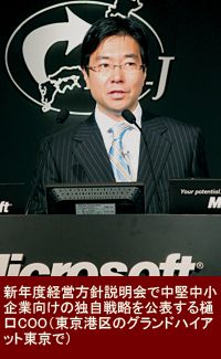 7月9日に東京都内のホテルで開いたマイクロソフトの「新年度経営方針説明会」では、本紙1面で触れた“顧客への訪問部隊の新設”といった新施策のほか、新製品を出荷する前のローカライズ(現地化)や、顧客に提供する前の検証などを充実させて品質を高める「品質担当」を配置したことなど独自の新戦略を公表している。就任4か月で早くも“樋口色”が鮮明になったわけだ。
