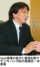 ソフトバンクグループでは現在、ソフトバンクBBの流通事業でセールスフォース・ドットコムの販売代理店となり、SaaSプラットフォームを販売している。加えて、ソフトバンクモバイルがスマートフォンを市場投入していることから、SaaSプラットフォームとスマートフォンを組み合わせることができる。ソフトバンクBBの高瀬正一・コマース&サービス統括コーポレート事業推進本部長は、「スマートフォンとSaaSを組み合わせ、さまざまなアプリケーションに対応させることで、早期に事業の柱の1つとして成長させる」方針を示しており、流通側からモバイル関連製品・サービスの創造を模索している。加えて、ヤフーがグループ企業であることから、ネット側からSaaSの提供も可能。すでに、ヤフーではコンシューマユーザーに対してSaaS型サービスを提供しており、法人向けにもサービスインできる基盤が整っている。流通部門では、「サービスやストックビジネスの売り上げ比率として30%を目指す」(高瀬本部長)としており、グループ連携による法人向けSaaSビジネスへの参入は十分に可能性がある。