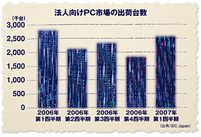 日本HPも、「今年は徹底的にパソコンを販売していくことでマーケットシェアでトップ3を目指す」(平松進也・パーソナルシステムズ事業統括デスクトップビジネス本部長)としている。「国内メーカーが法人向けパソコンに行きづまりを感じているのではないか。今なら、シェアを奪える」とみているからだ。日立への製品供給で部材コストの削減も可能で、「パソコンで十分に利益を確保できる」状況。しかも、「将来的には仮想化ソリューションの提供」を視野に入れており、できるだけ多くユーザー企業を獲得するために、「まずはパソコンを導入させている」という。
