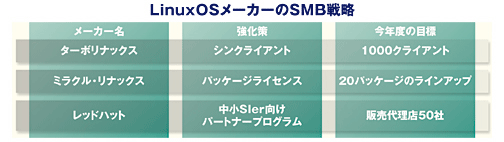 LinuxOSメーカーがSMB向け事業の強化に乗り出しているのは、「大企業を顧客対象としたビジネスでは、大手SIerとのパートナーシップ強化でミッションクリティカル分野のシステム案件が増えるという効果が出ている。ユーザー企業の増加に向け、SMBを開拓することが重要と判断した」(レッドハットの藤田社長)ためだ。「ウェブサーバーなどインターネットのインフラでは、LinuxOSが主流になった。次のステップとして、基幹業務サーバーでLinuxOSの採用を加速できる」(ミラクル・リナックスの佐藤社長)との見方もある。また、「シンクライアントソリューションを提供すれば、ユーザー企業がWindows対応のアプリケーションを使わなくなるとは考えていない。しかし、サーバーへのアクセスでアプリケーションを使うという意識が高まれば、将来的にはOSにこだわらないようになるだろう。ユーザー企業が用途に応じてWindowsやLinuxを選択できる環境を整えていきたい」(ターボリナックスの矢野社長)意向もある。