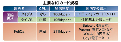 また日本では01年にJR東日本が「Suica(スイカ)」の名称でICカード型定期券として首都圏で発行、次いでJR西日本が03年に「ICOCA(イコカ)」を、04年には関西私鉄系IC乗車券「PiTaPa(ピタパ)」、さらに昨年は東京メトロなど共通カード「Pasmo(パスモ)」の発行と同時にSuicaとの相互利用が実現した。現在はSuica、ICOCA、PiTaPa、Pasmoの相互利用が可能となっている。