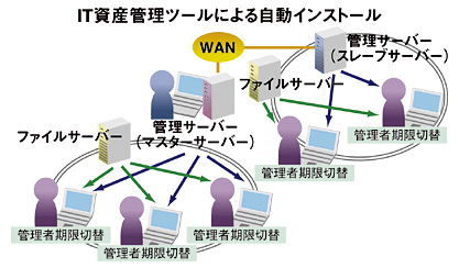 また、IT資産管理ツールを導入することでセキュリティ対策を大幅に強化することができる。例えば、OSのセキュリティパッチやウイルス対策ソフトのパターンファイルのアップデートを個人に任せてしまうと、必ず放置する者が出てくる。IT資産管理ツールを使えば、そうした作業が自動的に行えるので、セキュリティ上のリスクを抑えられる。さらに、各パソコンで使用されているソフトウェアを一元管理することにより、情報漏えいの要因となる不正なファイル共有ソフトの使用を禁止・監視することもできる。