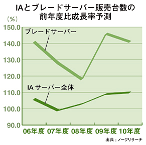 唯一の期待の星といえるブレードサーバーは急成長中とはいえ、まだ利用用途や購入する顧客が限定的で母数が小さい。IT調査会社のノークリサーチによれば、今年度(07年4月-08年3月)の全IAサーバーのなかでブレードが占める割合は2ポイントアップと予測する。ただ、予測通りに伸びたとしてもまだ10%程度。ブレード人気に火を付けたサーバー統合のニーズも「08年にピークを迎え、09年以降は縮小に転じる」(IDC Japan)との見方もある。ブレードがハード事業の救世主になるような状況は望めそうもない。各販売系SIerはハード事業の比率がまだ高く、全体の業績を圧迫する。これが08年を「曇り」と予想する最大の理由だ。