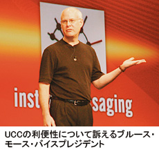 基調講演に登壇したユニファイド・コミュニケーション関連のソフトウェア責任者であるブルース・モース・バイスプレジデントは、「UCCビジネスでは、さまざまなベンダーとパートナーシップを深める」とアピール。パートナーとしてエリクソンやシスコシステムズ、ノーテルネットワークスをあげ、さらには「NECとの提携も実現した」としている。