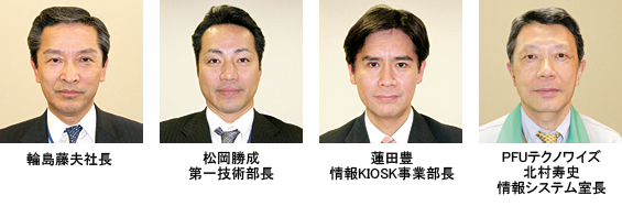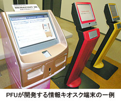 石川県にあるProDeS事業の生産拠点「ProDeSセンター」では、顧客からの依頼にもとづいてプロトタイプを開発。実機に触れながら改良を重ねることで、「満足度の高い製品」(輪島社長)に仕上げている。たとえば、60度の高温に耐える耐熱性や防塵・防滴の機能をパソコンに付加したり、石けん箱ほどの小さなケースにCPUやメモリなどパソコンの主要機能を組み込んだりと、「顧客の用途に合わせたIT機器を開発する」(松岡勝成・ProDeSグループシステムプロダクト事業部第一技術部長)ことを得意とする。 ProDeS事業のなかでも、ここ数年、とくに伸びが大きいのが情報キオスク端末(写真)だ。簡単な操作でさまざまな情報が取り出せる端末で、ATM(現金自動預け払い機)や自販機と並ぶ有望市場に成長し、コンビニなどのチェーン店や公共団体、病院などに納入実績を積み重ねている。PFUは、情報キオスク端末の分野では自社の国内シェアが50%近くにまで達していると推計する。