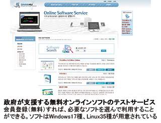 http://www.onss4u.net)も運営している。ここでは誰でも無料でSaaSを体験できるようなっている。OSをWindows用とLinux用に分け、Office(文書作成)、マルチメディア、翻訳ソフトなど60項目を会員登録するだけで利用できる。