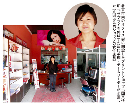 その前段階として今年3月、北京市内に3か所のプリントショップを開設した。東京の大手町にあたるビジネス街の一角に店舗を構える「図文快印」には複数台のプリンタが並び、企業からの注文に応じている。このショップを企画した日沖のプロダクトマーケティングに所属する羊柳・チームリーダーは「小さい企業ほどプリンタを買わず、ショップで大量印刷する。サプライ品の売り上げを伸ばすうえで、このビジネスモデルは浸透するはず」と、自信をみせる。